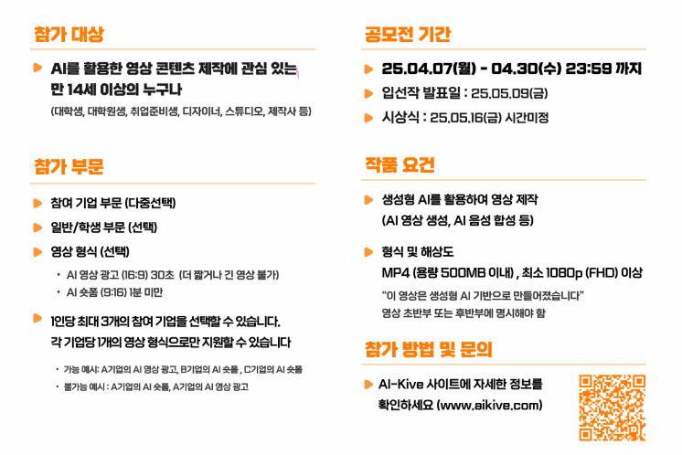 - 참가 형식: AI 광고 영상(16:9)과 AI 숏폼 광고 영상(9:16)